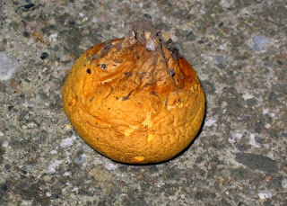 I looked around for an identification in mushroom guides and on the internet. The best match I could find is Calvatia rubroflava, also known as Orange-staining Puffball. (If anyone has a better identification, please leave a comment.) The linked site notes that although the mushroom is edible, "it is distinctly unpalatable and the odor of the mature mushroom is very disagreeable." The smell of this one certainly matches the description. I could smell it from several feet away!