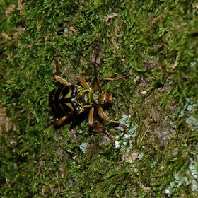This beetle, which seems to be a longhorned borer beetle (family Cerambycidae), was crawling along the side of the dead tree shown below. At first I was fooled by its bold black-and-yellow pattern and thought it was a wasp. A closer look revealed the tell-tale shape of a beetle. I am not sure what species this is, despite its bold pattern.
