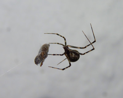 The second spider is most likely a House Spider (Parasteatoda tepidariorum) or a closely-related species. It caught a small moth, probably a micromoth. This moth is so well wrapped that I am not even sure what superfamily it belongs in. Seeing these two acts of predation make me wonder how much my black light influenced the spiders' success. Were these moths blundering around the back of the house because their direction-finding capabilities were addled by the ultraviolet light? Or would these moths have been caught anyway?